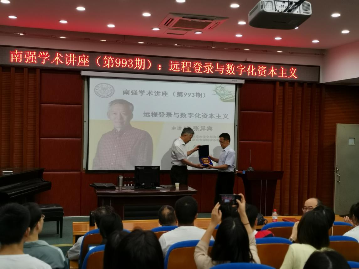 讲座正式开始,张异宾教授指出,习近平总书记提出“加强当代资本主义研究”课题,在新时代具有十分重要性。他以日常生活中发生的现象为例,生动地解读了“远程登录”和“数字化资本主义”两个概念。接着,张异宾教授以通俗的语言阐释了康德的空间和时间观念,指出在数字化时代,物理空间发生变化、空间距离归零、时间差距同质化为电子即时的时间。张教授用许多生动形象的例子来介绍“数字化资本主义”下的非物质劳动和劳动价值论。最后,张教授指出数字化资本主义对我们的控制是瞬间的,且将影响我们生活的方方面面。